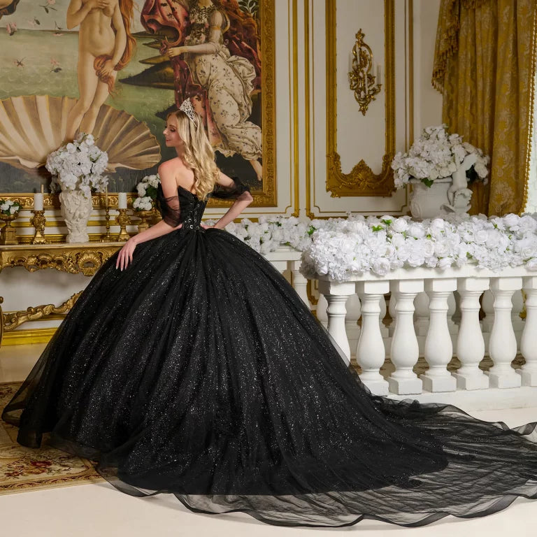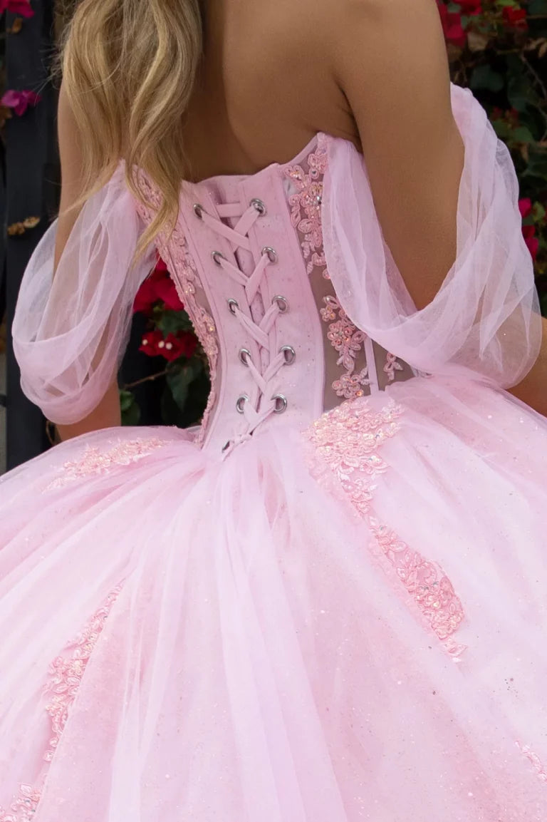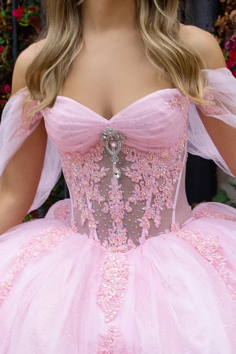 Sheer Bodice Lace Embellished Glitter Mesh Sweetheart Quinceanera Dress